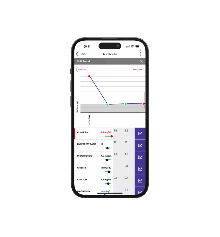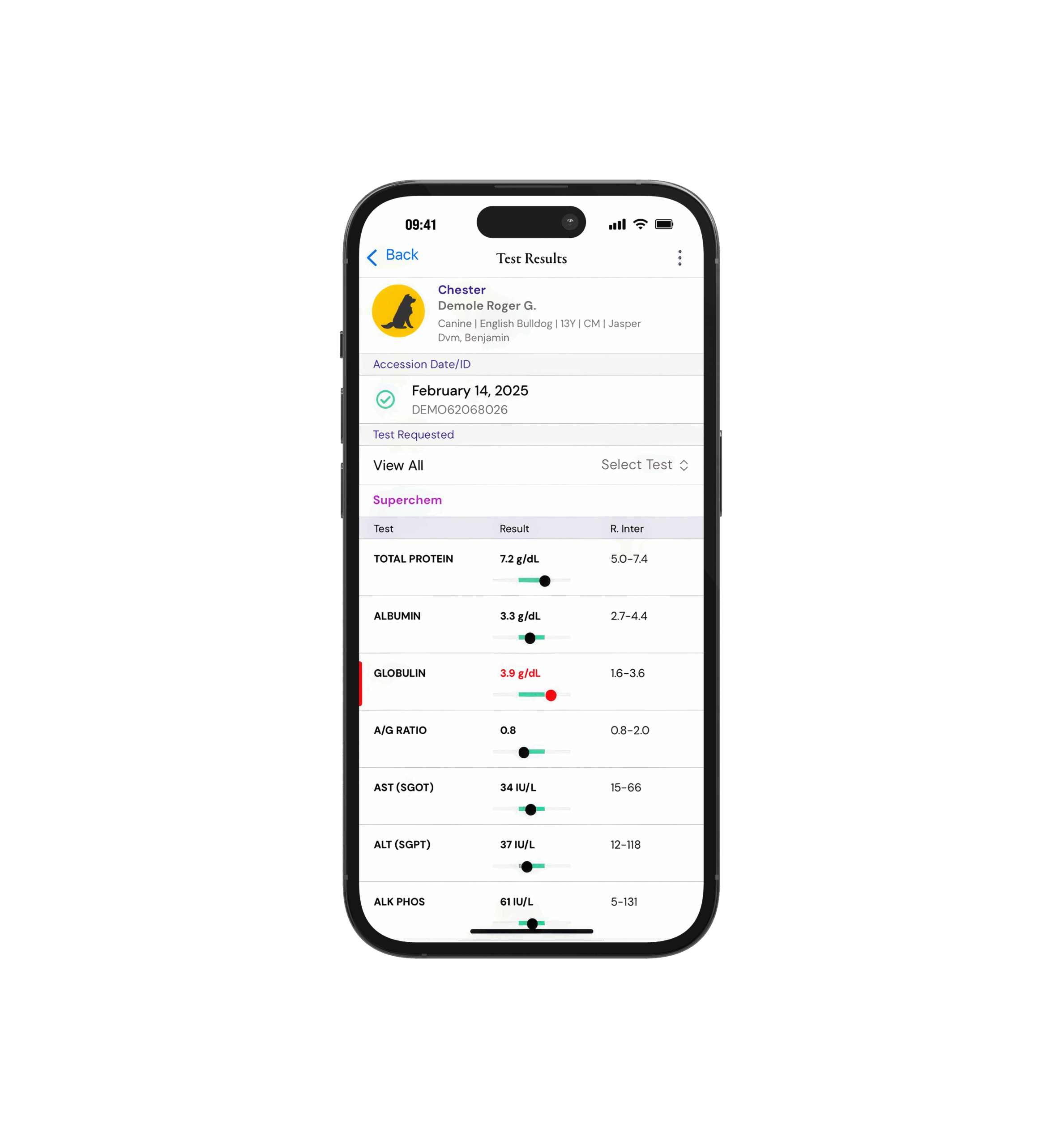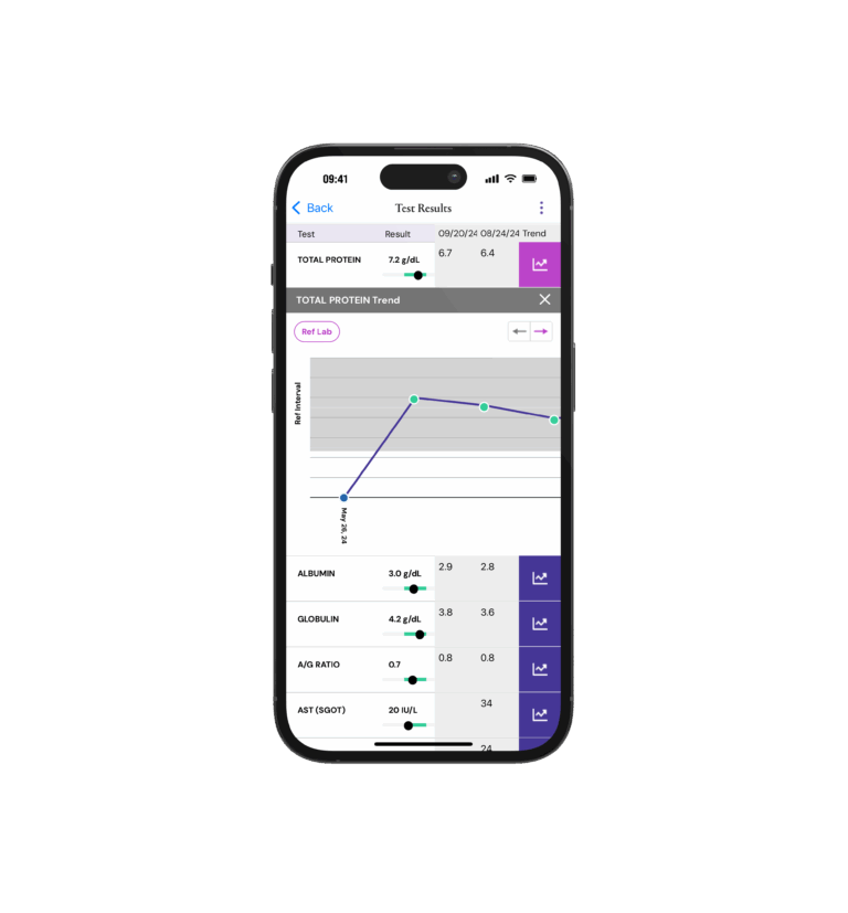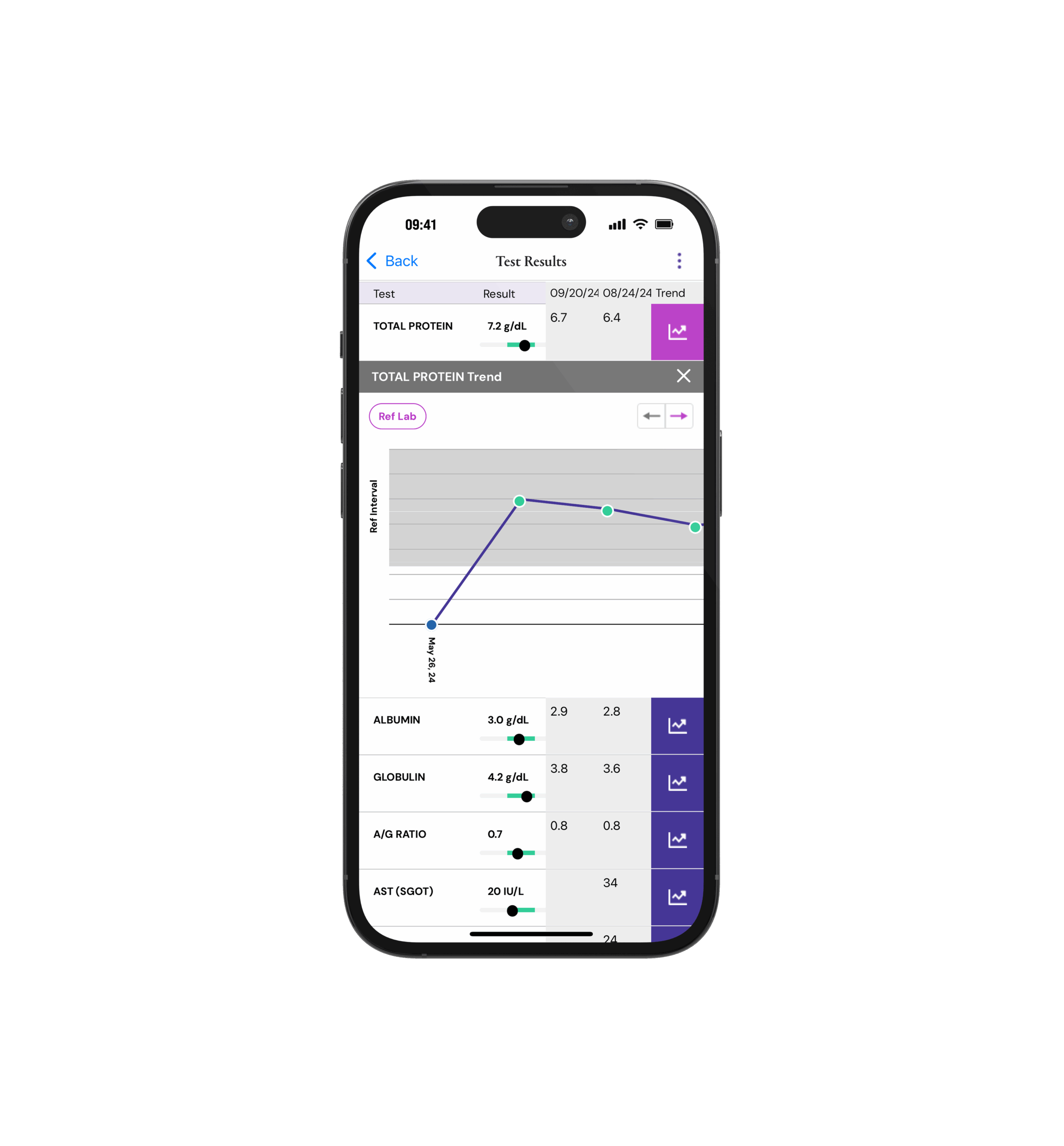 - Easy-to-read laboratory results with visual reference intervals, interpretative comments, and historical trends.
