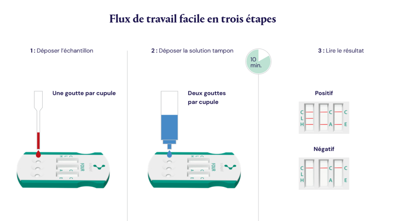 Élimine l'enclenchement manuel ; la réaction du test démarre automatiquement lors de l'introduction de l'échantillon et de la solution tampon.